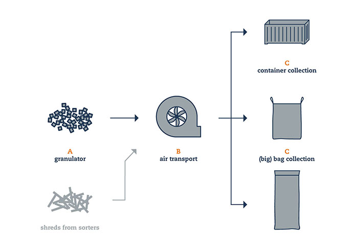 In the flowchart below, you see how the shreds are extracted from the granulator (A) by the transport fan (B) towards the shred collection unit of choice (C). Our solutions can also handle shreds from online destruction solutions (shreds from sorters, for instance). Even more so, Royal Dutch Kusters Engineering has successfully connected hundreds of these online destruction systems – irrespective of the brand – to our shreds handling solutions worldwide.