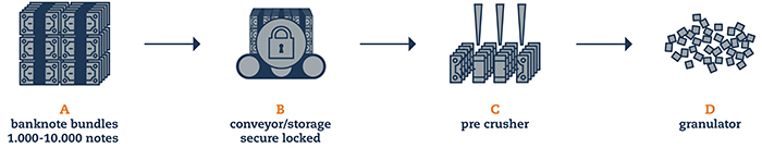 The entire process flowchart from the two-stage destruction to the collection of unfit banknotes can be found in our banknote destruction brochure.